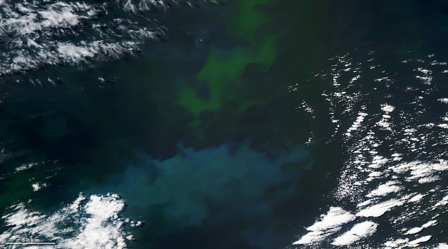 As explained by NASA specialist Michael Carlowicz, although it is difficult to pinpoint via satellite images, the blue patch indicates the presence of coccolithophores, and the green patch the aggregation of diatoms. These marine algae are essential for feeding several species, but also for oxygen production and for sequestration of carbon from the atmosphere.